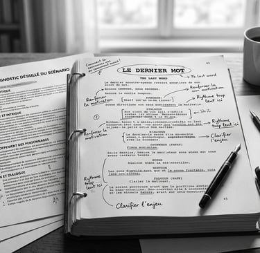 Nous savons qu'une scène magistrale à l’écrit doit aussi être réalisable et budgétairement cohérente. En travaillant avec nous, vous bénéficiez d’un regard qui anticipe les enjeux techniques et logistiques dès l'écriture. Nous transformons votre scénario en un outil de travail prêt à l'emploi, aussi puissant pour le lecteur qu'efficace pour le producteur, garantissant une histoire à la fois percutante et prête à être tournée.